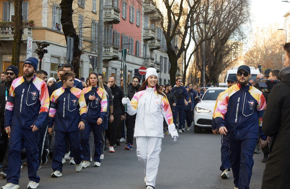 Hiba carried the flame along Viale Beatrice d’Este, before it continued toward Milan’s Giuseppe Meazza Stadium for the opening ceremony.