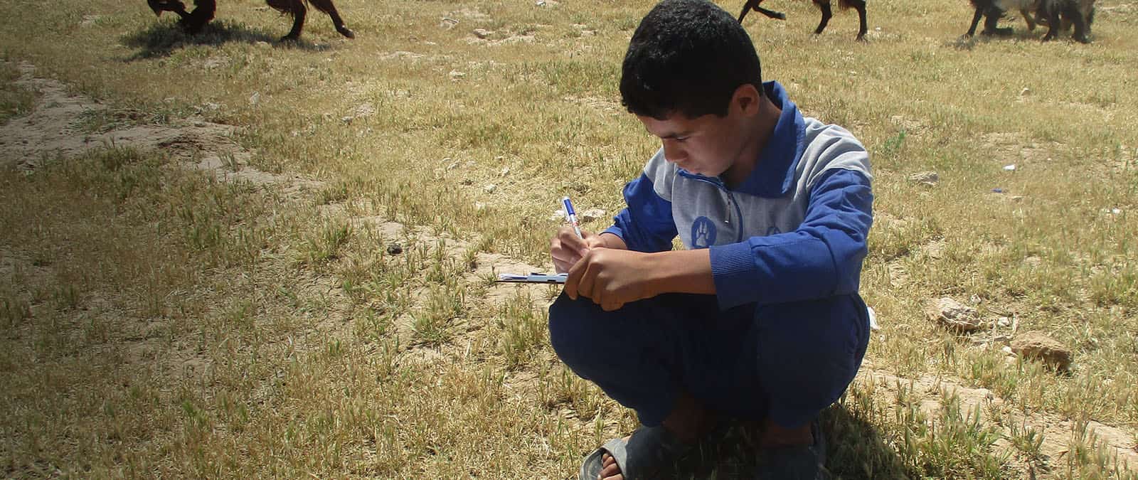Hamza studies outside with his new learning materials.