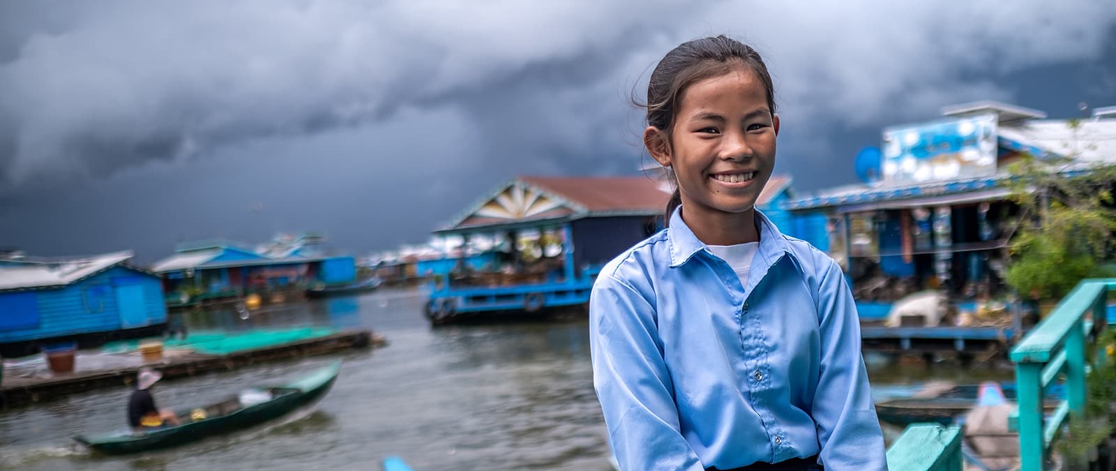 Ratana, 12, travelling to school by boat on Tonle Sap Lake, Cambodia.