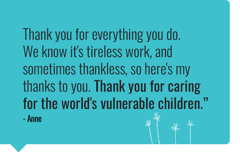 These precious gifts are brought to life through the tireless efforts of our program staff delivering life-changing aid and programs to children and families around the world.