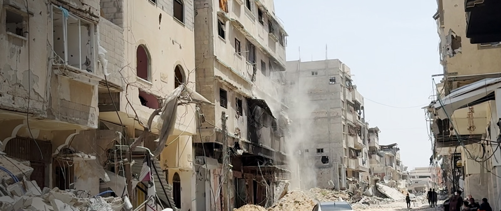 Rubble in Khan Younis, where families are frequently seen digging through the rubble and pitching tents