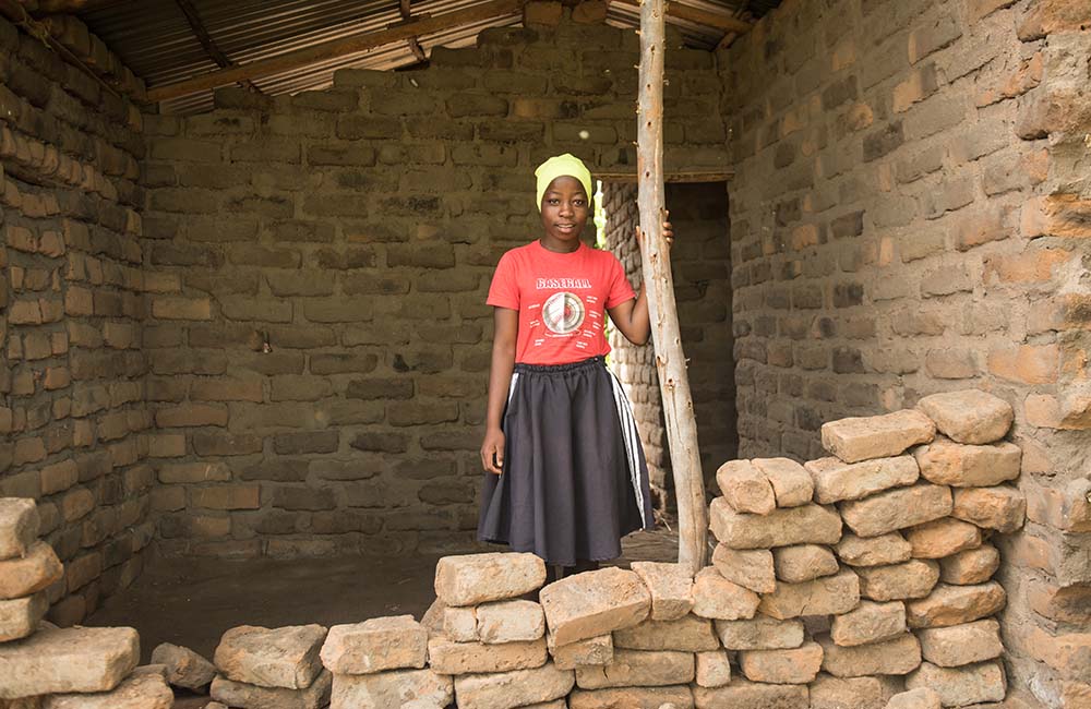 Esther, 17, Climate Champion outside her home knocked down during floods, Zomba, Malawi.
